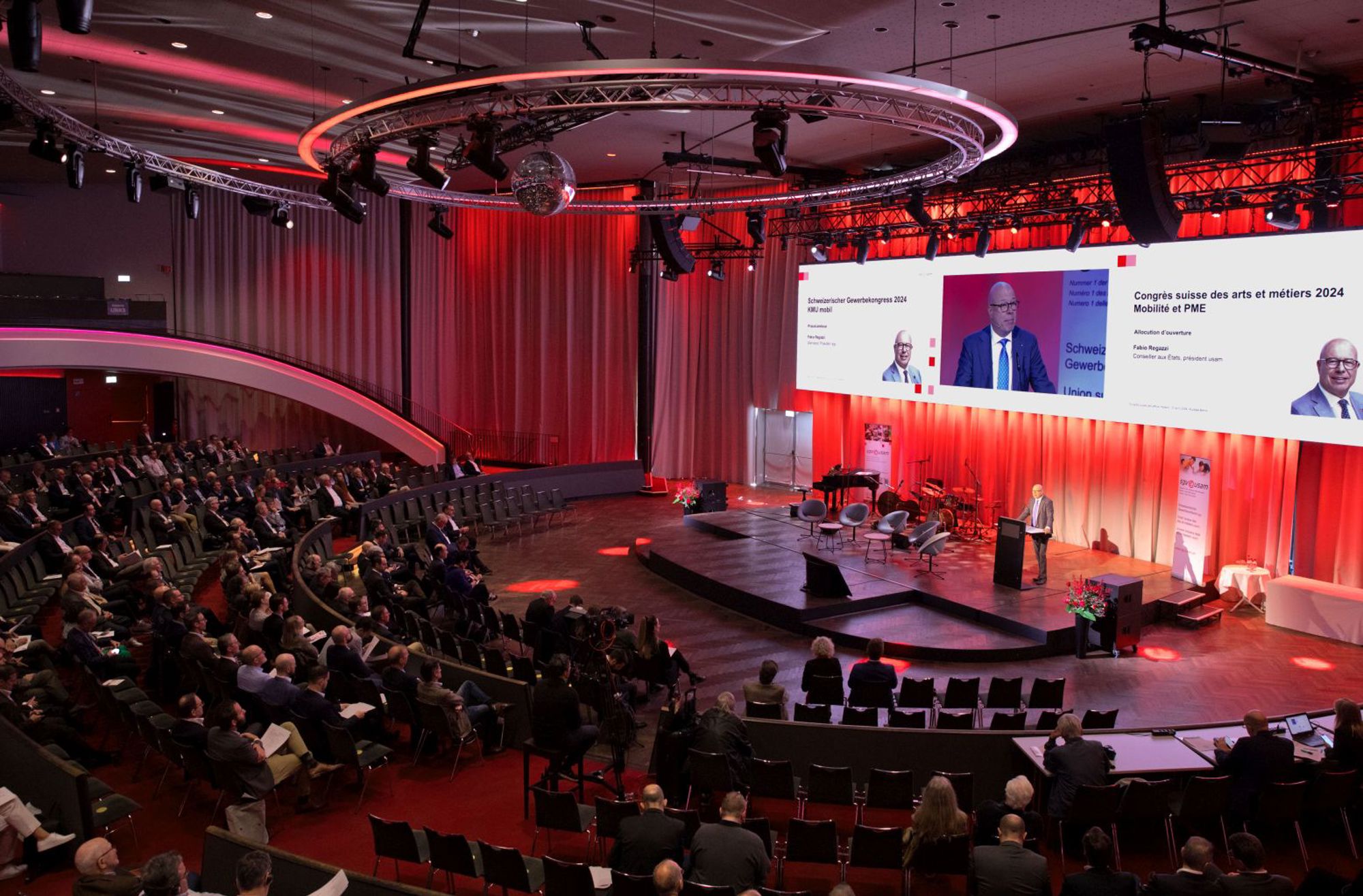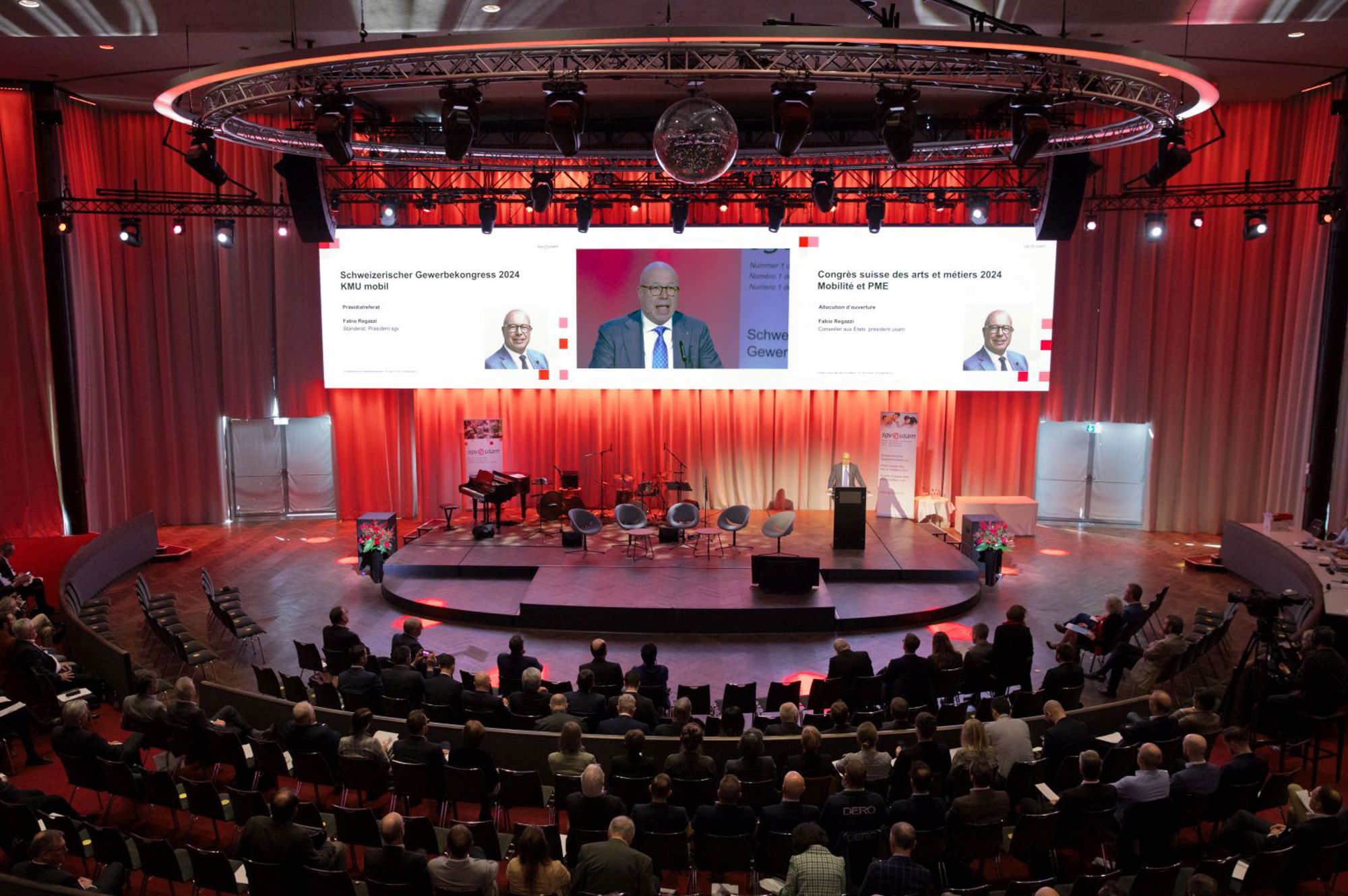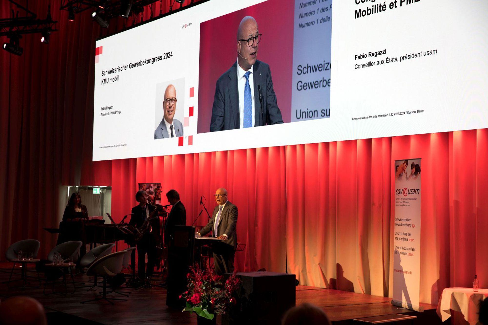 Der Schweizerische Gewerbeverband sgv hat im Rahmen des alle zwei Jahre stattfindenden Gewerbekongresses seine Gremien neu gewählt. Der wiedergewählte Präsident, «Die Mitte»-Ständerat Fabio Regazzi betonte in seiner Rede, dass der sgv trotz erzielten Erfolgen weiterhin hartnäckig in seinem Kerngeschäft bleibe: Dem Kampf gegen unnötige Regulierungskosten. Mit der Wahl des neuen Direktors im letzten Jahr seien die Weichen für eine erfolgreiche Zukunft gestellt. Der Kongress fand unter dem Motto «KMU mobil» statt. Regazzi sprach in seiner Rede dementsprechend auch die Wichtigkeit der kommenden Abstimmung zum Nationalstrassenausbau STEP an. Auch die Keynote des Ehrengastes Bundesrat Albert Rösti drehte sich unter anderem um das Thema Mobilität.